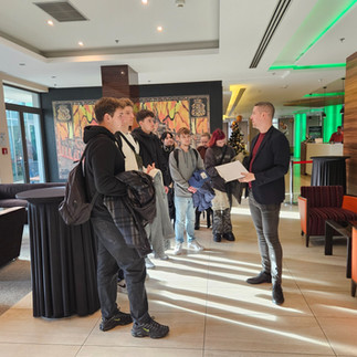 Druhou zastávkou bol hotel Holiday Inn 4* v historickom centre Trnavy. Videli sme priestory loby baru, reštaurácie Culinaria, kongresovú sálu pre 700 hostí, štúdio a apartmán. Dozvedeli sme sa o franchisingovej prevádzke hotela v rámci siete IHG, o ponúkaných službách, kontrole štandardov, cenotvorbe či o spolupráci so strednými školami prostredníctvom praxe alebo duálnym vzdelávaním. Potom sme vychutnávali atmosféru trnavských vianočných trhov a išli sme vlakom späť. Počasie sa vydarilo, tak aj prechádzka mestom bola príjemná.